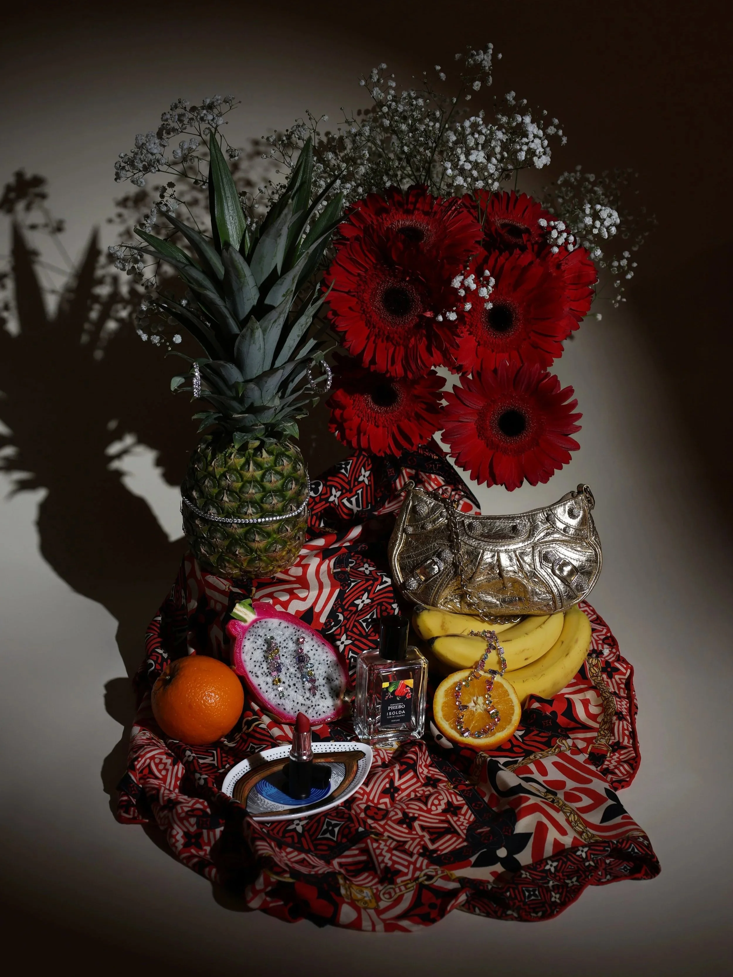 The project translates her signature aesthetic into a contemporary still life using styling and object selection as the primary tools of communication. Key elements include Isolda Cajueiro Phebo perfume, representing energy, heat, and Brazilian identity; MAC red lipstick, referencing her signature look; the Balenciaga Le Cagole Mini, expressing exaggeration and statement dressing; Swarovski Gema jewelry, introducing sparkle and movement; the Jonathan Adler Eye Trinket Tray, reinforcing maximalist expression; and Louis Vuitton silk scarf, adding color, layering, and references to her iconic head wraps.